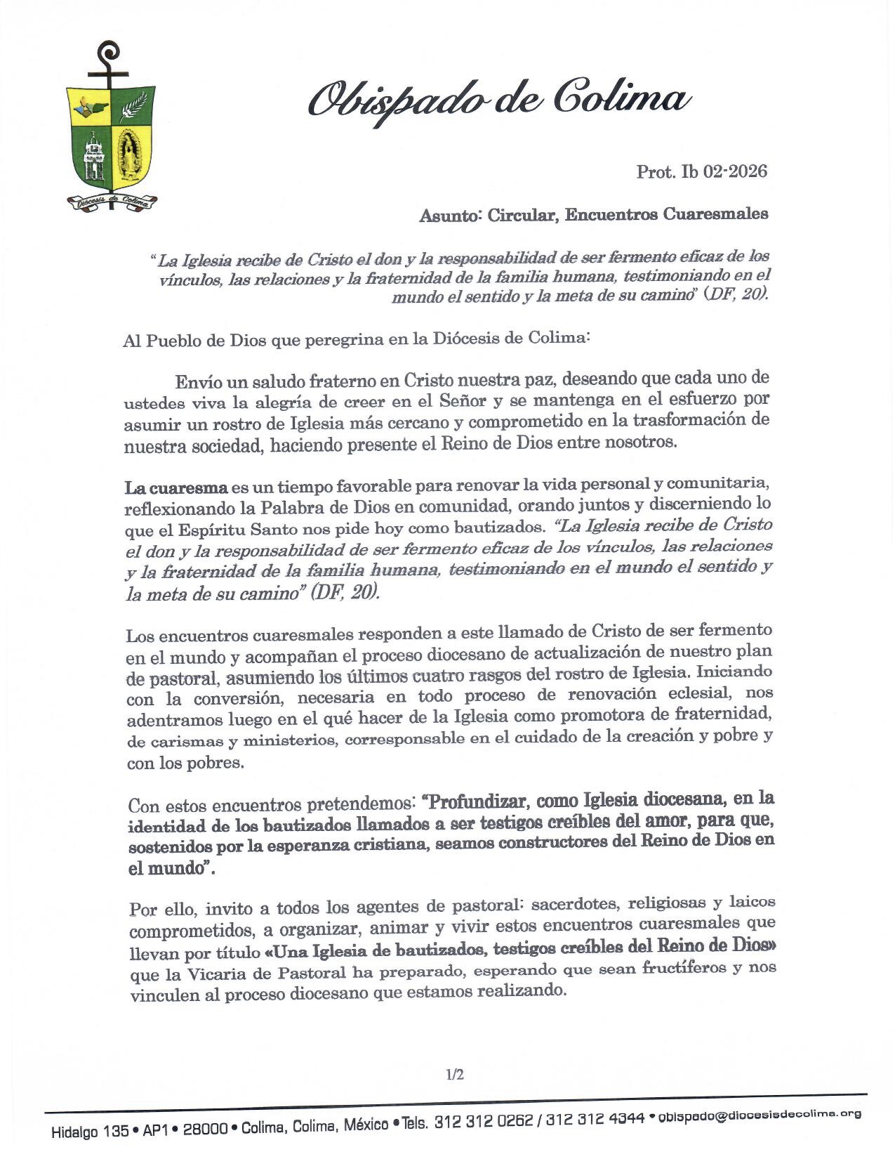 Al Pueblo de Dios que peregrina en la Diócesis de Colima:
